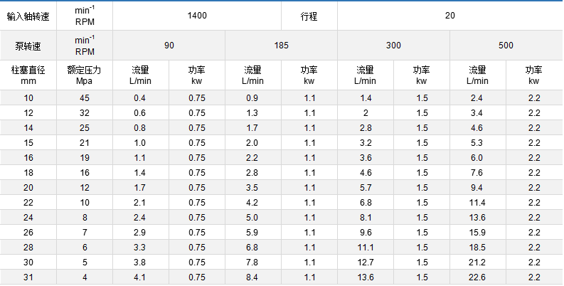 適用于閥門管道試壓泵、高壓清洗泵、計(jì)量泵、流程泵、加藥泵、液壓泵、輸油泵等專門的用泵。 組裝型式:有臥式、立式、固定式、移動(dòng)式。 傳動(dòng)型式:有電動(dòng)機(jī)、柴油機(jī)、齒輪箱、皮帶輪、電磁調(diào)速、變頻調(diào)速。 表中技術(shù)參數(shù)作為選型參考,每個(gè)品種的泵都裝有安全調(diào)壓閥,泵的壓力可任意調(diào)節(jié)。 你選型時(shí)表中流量不合適,可用電磁調(diào)速,變頻調(diào)速,變換柱塞直徑來調(diào)節(jié)流量,滿足選型需要。